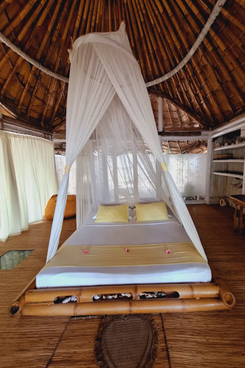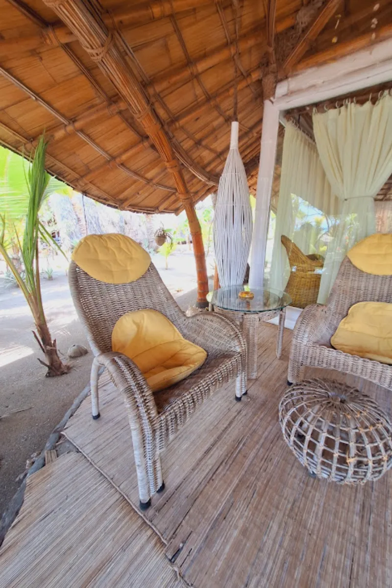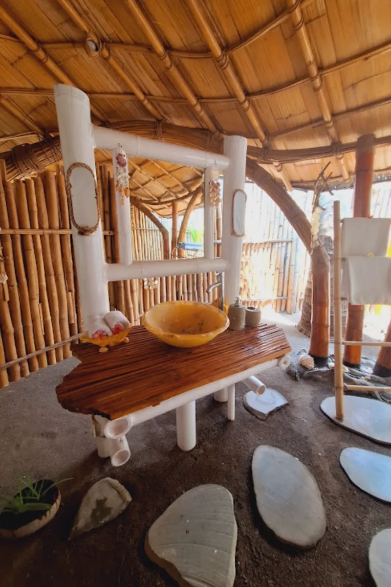 Le travail du bois et du bambou : Des structures des bungalows aux finitions des salles de bain, le bois brut est omniprésent, créant une atmosphère chaleureuse et authentique.
